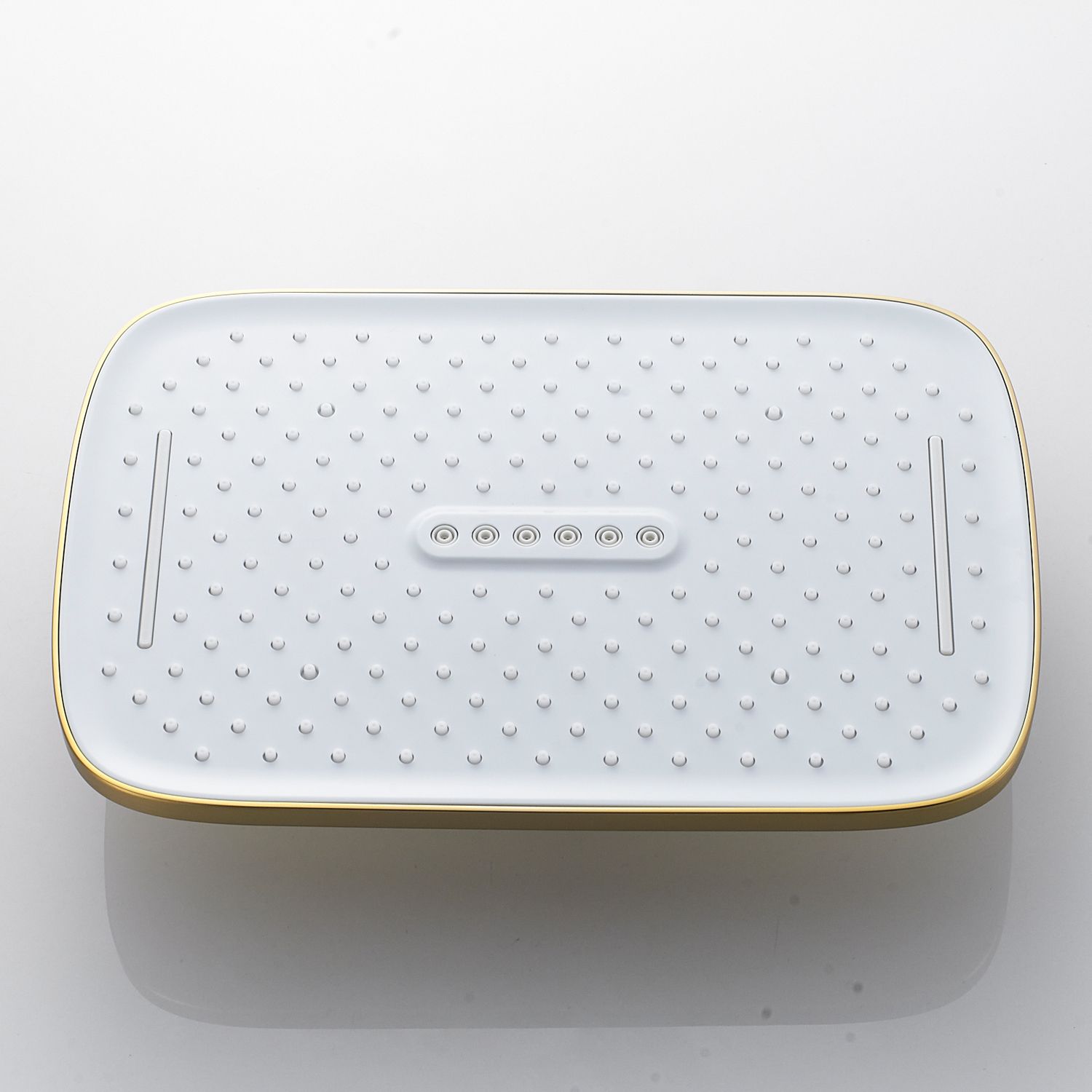 Верхний душ размером 310x210 мм из ABS-пластика легко регулируется по наклону благодаря встроенному шарниру. Он также оснащен самоочищающимися силиконовыми форсунками, которые защищают его от известкового налета, обеспечивая всегда чистый и сильный поток воды.