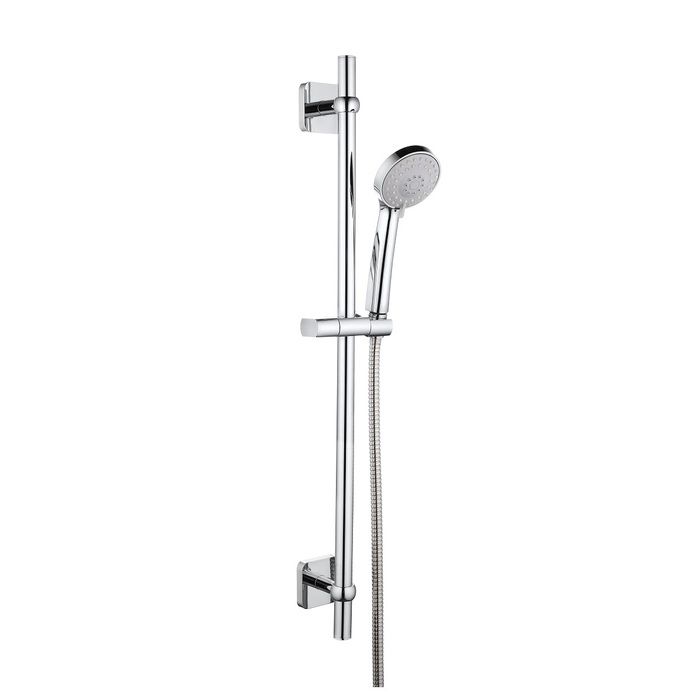 Душевой гарнитур. Стойка для душа, нержавеющая сталь с никель-хромовым покрытием, высота 650 мм, диаметр 22 мм. Оба крепления свободные. Держатель лейки из ABS-пластика, поворотное крепление, регулировка наклона лейки. Лейка для душа из ABS-пластика, диаметр 80 мм, 3 режима (Дождь, Массаж, Дождь&Массаж). Шланг для душа ПВХ в оплетке из нержавеющей стали, 1,5 метра, с системами Double Lock и Twist Free. В комплекте: крепеж.