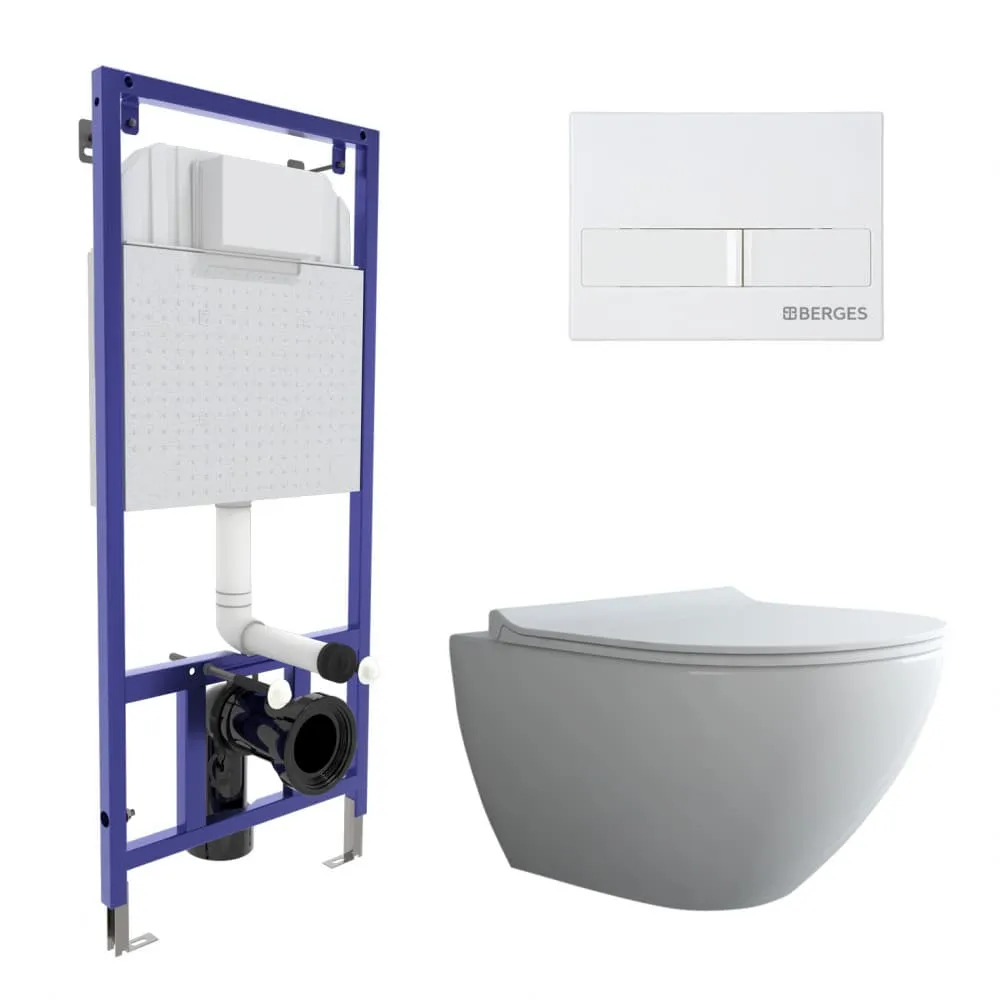 Свойства. Полный комплект BERGES для монтажа подвесного унитаза: узкая инсталляция NOVUM525: толщина бачка 80мм, смыв 3/7 литра, нагрузка 400 кг, антикоррозийное покрытие, кнопка L1 белая, унитаз PUMA XL Rimless 55 см, сиденье дюропласт Toma Slim SO. Все крепежи для установки в комплекте. Возможность установки в угол.