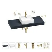 1 x cтолешница для раковины, арт. 162007000 (размер 120*50 см, цвет структурный антрацит); 1 х керамическая раковина, арт. 150901000 (размер 43*36 см, цвет глянцевый белый); 1 x декоративная заглушка на отверстие перелива раковины (цвет хром); 1 х смеситель для раковины, арт. 182403000 (цвет золото); 2 х гибкая подводка для подключения смесителя, 45 см; 1 x сифон для раковины, арт. 182121000 (цвет золото); 1 x донный клапан для раковины, арт. 182131000 (цвет золото); 2 x угловой вентиль, арт. 182148000 (цвет золото); 1 x дозатор для жидкого мыла с держателем, арт. 182513000 (стекло матовое, держатель золото); 1 x мыльница с держателем, арт. 182503000 (стекло матовое, держатель золото); 1 x стакан для зубных щеток с держателем, арт. 182508000 (стекло матовое, держатель золото); 2 x крючок для полотенца/халата, арт. 182518000 (цвет золото); 7 x комплект креплений для монтажа; 9 x инструкция по монтажу и эксплуатации; 9 x гарантийный талон. |