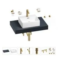 1 x cтолешница для раковины, арт. 162005000 (размер 80*50 см, цвет структурный антрацит); 1 х керамическая раковина, арт. 150901000 (размер 43*36 см, цвет глянцевый белый); 1 x декоративная заглушка на отверстие перелива раковины (цвет хром); 1 х смеситель для раковины, арт. 182403000 (цвет золото); 2 х гибкая подводка для подключения смесителя, 45 см; 1 x сифон для раковины, арт. 182121000 (цвет золото); 1 x донный клапан для раковины, арт. 182131000 (цвет золото); 2 x угловой вентиль, арт. 182148000 (цвет золото); 1 x дозатор для жидкого мыла с держателем, арт. 182513000 (стекло матовое, держатель золото); 1 x мыльница с держателем, арт. 182503000 (стекло матовое, держатель золото); 1 x стакан для зубных щеток с держателем, арт. 182508000 (стекло матовое, держатель золото); 2 x крючок для полотенца/халата, арт. 182518000 (цвет золото); 7 x комплект креплений для монтажа; 9 x инструкция по монтажу и эксплуатации; 9 x гарантийный талон. |