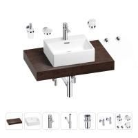 1 x cтолешница для раковины, арт. 162013000 (размер 80*50 см, цвет темный дуб Гварнери); 1 х керамическая раковина, арт. 150901000 (размер 43*36 см, цвет глянцевый белый); 1 x декоративная заглушка на отверстие перелива раковины (цвет хром); 1 х смеситель для раковины, арт. 182401000 (цвет хром); 2 х гибкая подводка для подключения смесителя, 45 см; 1 x сифон для раковины, арт. 182119000 (цвет хром); 1 x донный клапан для раковины, арт. 182129000 (цвет хром); 2 x угловой вентиль, арт. 182146000 (цвет хром); 1 x дозатор для жидкого мыла с держателем, арт. 182511000 (стекло матовое, держатель хром); 1 x мыльница с держателем, арт. 182501000 (стекло матовое, держатель хром); 1 x стакан для зубных щеток с держателем, арт. 182506000 (стекло матовое, держатель хром); 2 x крючок для полотенца/халата, арт. 182516000 (цвет хром); 7 x комплект креплений для монтажа; 9 x инструкция по монтажу и эксплуатации; 9 x гарантийный талон. |