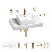1 x cтолешница для раковины, арт. 162017000 (размер 80*50 см, цвет матовый белый); 1 х керамическая раковина, арт. 150901000 (размер 43*36 см, цвет глянцевый белый); 1 x декоративная заглушка на отверстие перелива раковины (цвет хром); 1 х смеситель для раковины, арт. 182403000 (цвет золото); 2 х гибкая подводка для подключения смесителя, 45 см; 1 x сифон для раковины, арт. 182121000 (цвет золото); 1 x донный клапан для раковины, арт. 182131000 (цвет золото); 2 x угловой вентиль, арт. 182148000 (цвет золото); 1 x дозатор для жидкого мыла с держателем, арт. 182513000 (стекло матовое, держатель золото); 1 x мыльница с держателем, арт. 182503000 (стекло матовое, держатель золото); 1 x стакан для зубных щеток с держателем, арт. 182508000 (стекло матовое, держатель золото); 2 x крючок для полотенца/халата, арт. 182518000 (цвет золото); 7 x комплект креплений для монтажа; 9 x инструкция по монтажу и эксплуатации; 9 x гарантийный талон. |