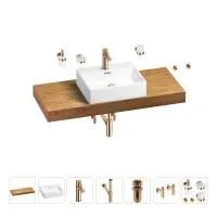 1 x cтолешница для раковины, арт. 162011000 (размер 120*50 см, цвет светлый дуб Оксфорд); 1 х керамическая раковина, арт. 150902000 (размер 50*42 см, цвет глянцевый белый); 1 x декоративная заглушка на отверстие перелива раковины (цвет хром); 1 х смеситель для раковины, арт. 182404000 (цвет розовое золото); 2 х гибкая подводка для подключения смесителя, 45 см; 1 x сифон для раковины, арт. 182122000 (цвет розовое золото); 1 x донный клапан для раковины, арт. 182132000 (цвет розовое золото); 2 x угловой вентиль, арт. 182149000 (цвет розовое золото); 1 x дозатор для жидкого мыла с держателем, арт. 182514000 (стекло матовое, держатель розовое золото); 1 x мыльница с держателем, арт. 182504000 (стекло матовое, держатель розовое золото); 1 x стакан для зубных щеток с держателем, арт. 182509000 (стекло матовое, держатель розовое золото); 2 x крючок для полотенца/халата, арт. 182519000 (цвет розовое золото); 7 x комплект креплений для монтажа; 9 x инструкция по монтажу и эксплуатации; 9 x гарантийный талон. |