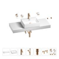 1 x cтолешница для раковины, арт. 162019000 (размер 120*50 см, цвет матовый белый); 1 х керамическая раковина, арт. 150902000 (размер 50*42 см, цвет глянцевый белый); 1 x декоративная заглушка на отверстие перелива раковины (цвет хром); 1 х смеситель для раковины, арт. 182404000 (цвет розовое золото); 2 х гибкая подводка для подключения смесителя, 45 см; 1 x сифон для раковины, арт. 182122000 (цвет розовое золото); 1 x донный клапан для раковины, арт. 182132000 (цвет розовое золото); 2 x угловой вентиль, арт. 182149000 (цвет розовое золото); 1 x дозатор для жидкого мыла с держателем, арт. 182514000 (стекло матовое, держатель розовое золото); 1 x мыльница с держателем, арт. 182504000 (стекло матовое, держатель розовое золото); 1 x стакан для зубных щеток с держателем, арт. 182509000 (стекло матовое, держатель розовое золото); 2 x крючок для полотенца/халата, арт. 182519000 (цвет розовое золото); 7 x комплект креплений для монтажа; 9 x инструкция по монтажу и эксплуатации; 9 x гарантийный талон. |