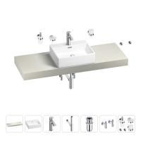 1 x cтолешница для раковины, арт. 162004000 (размер 140*50 см, цвет структурный белый); 1 х керамическая раковина, арт. 150902000 (размер 50*42 см, цвет глянцевый белый); 1 x декоративная заглушка на отверстие перелива раковины (цвет хром); 1 х смеситель для раковины, арт. 182301000 (цвет хром); 2 х гибкая подводка для подключения смесителя, 45 см; 1 x сифон для раковины, арт. 182119000 (цвет хром); 1 x донный клапан для раковины, арт. 182129000 (цвет хром); 2 x угловой вентиль, арт. 182146000 (цвет хром); 1 x дозатор для жидкого мыла с держателем, арт. 182511000 (стекло матовое, держатель хром); 1 x мыльница с держателем, арт. 182501000 (стекло матовое, держатель хром); 1 x стакан для зубных щеток с держателем, арт. 182506000 (стекло матовое, держатель хром); 2 x крючок для полотенца/халата, арт. 182516000 (цвет хром); 7 x комплект креплений для монтажа; 9 x инструкция по монтажу и эксплуатации; 9 x гарантийный талон. |
