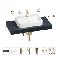 1 x cтолешница для раковины, арт. 162006000 (размер 100*50 см, цвет структурный антрацит); 1 х керамическая раковина, арт. 150801000 (размер 60*40 см, цвет глянцевый белый); 1 x декоративная заглушка на отверстие перелива раковины (цвет хром); 1 х смеситель для раковины, арт. 182403000 (цвет золото); 2 х гибкая подводка для подключения смесителя, 45 см; 1 x сифон для раковины, арт. 182121000 (цвет золото); 1 x донный клапан для раковины, арт. 182131000 (цвет золото); 2 x угловой вентиль, арт. 182148000 (цвет золото); 1 x дозатор для жидкого мыла с держателем, арт. 182513000 (стекло матовое, держатель золото); 1 x мыльница с держателем, арт. 182503000 (стекло матовое, держатель золото); 1 x стакан для зубных щеток с держателем, арт. 182508000 (стекло матовое, держатель золото); 2 x крючок для полотенца/халата, арт. 182518000 (цвет золото); 6 x комплект креплений для монтажа; 9 x инструкция по монтажу и эксплуатации; 9 x гарантийный талон. |