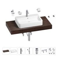 1 x cтолешница для раковины, арт. 162014000 (размер 100*50 см, цвет темный дуб Гварнери); 1 х керамическая раковина, арт. 150801000 (размер 60*40 см, цвет глянцевый белый); 1 x декоративная заглушка на отверстие перелива раковины (цвет хром); 1 х смеситель для раковины, арт. 182401000 (цвет хром); 2 х гибкая подводка для подключения смесителя, 45 см; 1 x сифон для раковины, арт. 182119000 (цвет хром); 1 x донный клапан для раковины, арт. 182129000 (цвет хром); 2 x угловой вентиль, арт. 182146000 (цвет хром); 1 x дозатор для жидкого мыла с держателем, арт. 182511000 (стекло матовое, держатель хром); 1 x мыльница с держателем, арт. 182501000 (стекло матовое, держатель хром); 1 x стакан для зубных щеток с держателем, арт. 182506000 (стекло матовое, держатель хром); 2 x крючок для полотенца/халата, арт. 182516000 (цвет хром); 6 x комплект креплений для монтажа; 9 x инструкция по монтажу и эксплуатации; 9 x гарантийный талон. |