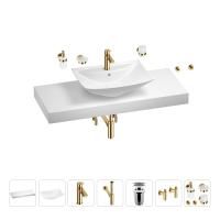 1 x cтолешница для раковины, арт. 162019000 (размер 120*50 см, цвет матовый белый); 1 х керамическая раковина с клапаном на отверстие слива, арт. 151001000 (размер 60*43 см, цвет глянцевый белый); 1 x декоративная заглушка на отверстие перелива раковины (цвет хром); 1 х смеситель для раковины, арт. 182303000 (цвет золото); 2 х гибкая подводка для подключения смесителя, 45 см; 1 x сифон для раковины, арт. 182121000 (цвет золото); 1 x выпуск для раковины, арт. 182144000 (цвет хром); 2 x угловой вентиль, арт. 182148000 (цвет золото); 1 x дозатор для жидкого мыла с держателем, арт. 182513000 (стекло матовое, держатель золото); 1 x мыльница с держателем, арт. 182503000 (стекло матовое, держатель золото); 1 x стакан для зубных щеток с держателем, арт. 182508000 (стекло матовое, держатель золото); 2 x крючок для полотенца/халата, арт. 182518000 (цвет золото); 6 x комплект креплений для монтажа; 9 x инструкция по монтажу и эксплуатации; 9 x гарантийный талон. |