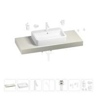1 x cтолешница для раковины, арт. 162003000 (размер 120*50 см, цвет структурный белый); 1 х керамическая раковина, арт. 150801000 (размер 60*40 см, цвет глянцевый белый); 1 x декоративная заглушка на отверстие перелива раковины (цвет хром); 1 х смеситель для раковины, арт. 182405000 (цвет матовый белый); 2 х гибкая подводка для подключения смесителя, 45 см; 1 x сифон для раковины, арт. 182123000 (цвет матовый белый); 1 x донный клапан для раковины, арт. 182133000 (цвет матовый белый); 2 x угловой вентиль, арт. 182150000 (цвет матовый белый); 1 x дозатор для жидкого мыла с держателем, арт. 182515000 (стекло матовое, держатель матовый белый); 1 x мыльница с держателем, арт. 182505000 (стекло матовое, держатель матовый белый); 1 x стакан для зубных щеток с держателем, арт. 182510000 (стекло матовое, держатель матовый белый); 2 x крючок для полотенца/халата, арт. 182520000 (цвет матовый белый); 6 x комплект креплений для монтажа; 9 x инструкция по монтажу и эксплуатации; 9 x гарантийный талон. |