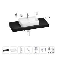 1 x cтолешница для раковины, арт. 162023000 (размер 120*50 см, цвет матовый черный); 1 х керамическая раковина, арт. 150801000 (размер 60*40 см, цвет глянцевый белый); 1 x декоративная заглушка на отверстие перелива раковины (цвет хром); 1 х смеситель для раковины, арт. 182401000 (цвет хром); 2 х гибкая подводка для подключения смесителя, 45 см; 1 x сифон для раковины, арт. 182119000 (цвет хром); 1 x донный клапан для раковины, арт. 182129000 (цвет хром); 2 x угловой вентиль, арт. 182146000 (цвет хром); 1 x дозатор для жидкого мыла с держателем, арт. 182511000 (стекло матовое, держатель хром); 1 x мыльница с держателем, арт. 182501000 (стекло матовое, держатель хром); 1 x стакан для зубных щеток с держателем, арт. 182506000 (стекло матовое, держатель хром); 2 x крючок для полотенца/халата, арт. 182516000 (цвет хром); 6 x комплект креплений для монтажа; 9 x инструкция по монтажу и эксплуатации; 9 x гарантийный талон. |