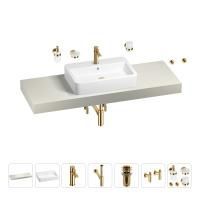1 x cтолешница для раковины, арт. 162004000 (размер 140*50 см, цвет структурный белый); 1 х керамическая раковина, арт. 150801000 (размер 60*40 см, цвет глянцевый белый); 1 x декоративная заглушка на отверстие перелива раковины (цвет хром); 1 х смеситель для раковины, арт. 182403000 (цвет золото); 2 х гибкая подводка для подключения смесителя, 45 см; 1 x сифон для раковины, арт. 182121000 (цвет золото); 1 x донный клапан для раковины, арт. 182131000 (цвет золото); 2 x угловой вентиль, арт. 182148000 (цвет золото); 1 x дозатор для жидкого мыла с держателем, арт. 182513000 (стекло матовое, держатель золото); 1 x мыльница с держателем, арт. 182503000 (стекло матовое, держатель золото); 1 x стакан для зубных щеток с держателем, арт. 182508000 (стекло матовое, держатель золото); 2 x крючок для полотенца/халата, арт. 182518000 (цвет золото); 6 x комплект креплений для монтажа; 9 x инструкция по монтажу и эксплуатации; 9 x гарантийный талон. |