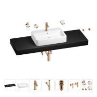 1 x cтолешница для раковины, арт. 162024000 (размер 140*50 см, цвет матовый черный); 1 х керамическая раковина, арт. 150801000 (размер 60*40 см, цвет глянцевый белый); 1 x декоративная заглушка на отверстие перелива раковины (цвет хром); 1 х смеситель для раковины, арт. 182404000 (цвет розовое золото); 2 х гибкая подводка для подключения смесителя, 45 см; 1 x сифон для раковины, арт. 182122000 (цвет розовое золото); 1 x донный клапан для раковины, арт. 182132000 (цвет розовое золото); 2 x угловой вентиль, арт. 182149000 (цвет розовое золото); 1 x дозатор для жидкого мыла с держателем, арт. 182514000 (стекло матовое, держатель розовое золото); 1 x мыльница с держателем, арт. 182504000 (стекло матовое, держатель розовое золото); 1 x стакан для зубных щеток с держателем, арт. 182509000 (стекло матовое, держатель розовое золото); 2 x крючок для полотенца/халата, арт. 182519000 (цвет розовое золото); 6 x комплект креплений для монтажа; 9 x инструкция по монтажу и эксплуатации; 9 x гарантийный талон. |