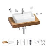 1 x cтолешница для раковины, арт. 162009000 (размер 80*50 см, цвет светлый дуб Оксфорд); 1 х керамическая раковина, арт. 150801000 (размер 60*40 см, цвет глянцевый белый); 1 x декоративная заглушка на отверстие перелива раковины (цвет хром); 1 х смеситель для раковины, арт. 182301000 (цвет хром); 2 х гибкая подводка для подключения смесителя, 45 см; 1 x сифон для раковины, арт. 182119000 (цвет хром); 1 x донный клапан для раковины, арт. 182129000 (цвет хром); 2 x угловой вентиль, арт. 182146000 (цвет хром); 1 x дозатор для жидкого мыла с держателем, арт. 182511000 (стекло матовое, держатель хром); 1 x мыльница с держателем, арт. 182501000 (стекло матовое, держатель хром); 1 x стакан для зубных щеток с держателем, арт. 182506000 (стекло матовое, держатель хром); 2 x крючок для полотенца/халата, арт. 182516000 (цвет хром); 6 x комплект креплений для монтажа; 9 x инструкция по монтажу и эксплуатации; 9 x гарантийный талон. |