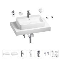 1 x cтолешница для раковины, арт. 162017000 (размер 80*50 см, цвет матовый белый); 1 х керамическая раковина, арт. 150801000 (размер 60*40 см, цвет глянцевый белый); 1 x декоративная заглушка на отверстие перелива раковины (цвет хром); 1 х смеситель для раковины, арт. 182301000 (цвет хром); 2 х гибкая подводка для подключения смесителя, 45 см; 1 x сифон для раковины, арт. 182119000 (цвет хром); 1 x донный клапан для раковины, арт. 182129000 (цвет хром); 2 x угловой вентиль, арт. 182146000 (цвет хром); 1 x дозатор для жидкого мыла с держателем, арт. 182511000 (стекло матовое, держатель хром); 1 x мыльница с держателем, арт. 182501000 (стекло матовое, держатель хром); 1 x стакан для зубных щеток с держателем, арт. 182506000 (стекло матовое, держатель хром); 2 x крючок для полотенца/халата, арт. 182516000 (цвет хром); 6 x комплект креплений для монтажа; 9 x инструкция по монтажу и эксплуатации; 9 x гарантийный талон. |