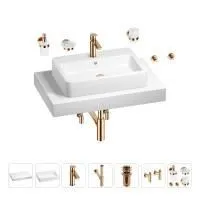 1 x cтолешница для раковины, арт. 162017000 (размер 80*50 см, цвет матовый белый); 1 х керамическая раковина, арт. 150801000 (размер 60*40 см, цвет глянцевый белый); 1 x декоративная заглушка на отверстие перелива раковины (цвет хром); 1 х смеситель для раковины, арт. 182304000 (цвет розовое золото); 2 х гибкая подводка для подключения смесителя, 45 см; 1 x сифон для раковины, арт. 182122000 (цвет розовое золото); 1 x донный клапан для раковины, арт. 182132000 (цвет розовое золото); 2 x угловой вентиль, арт. 182149000 (цвет розовое золото); 1 x дозатор для жидкого мыла с держателем, арт. 182514000 (стекло матовое, держатель розовое золото); 1 x мыльница с держателем, арт. 182504000 (стекло матовое, держатель розовое золото); 1 x стакан для зубных щеток с держателем, арт. 182509000 (стекло матовое, держатель розовое золото); 2 x крючок для полотенца/халата, арт. 182519000 (цвет розовое золото); 6 x комплект креплений для монтажа; 9 x инструкция по монтажу и эксплуатации; 9 x гарантийный талон. |