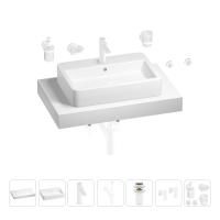 1 x cтолешница для раковины, арт. 162017000 (размер 80*50 см, цвет матовый белый); 1 х керамическая раковина, арт. 150801000 (размер 60*40 см, цвет глянцевый белый); 1 x декоративная заглушка на отверстие перелива раковины (цвет хром); 1 х смеситель для раковины, арт. 182405000 (цвет матовый белый); 2 х гибкая подводка для подключения смесителя, 45 см; 1 x сифон для раковины, арт. 182123000 (цвет матовый белый); 1 x донный клапан для раковины, арт. 182133000 (цвет матовый белый); 2 x угловой вентиль, арт. 182150000 (цвет матовый белый); 1 x дозатор для жидкого мыла с держателем, арт. 182515000 (стекло матовое, держатель матовый белый); 1 x мыльница с держателем, арт. 182505000 (стекло матовое, держатель матовый белый); 1 x стакан для зубных щеток с держателем, арт. 182510000 (стекло матовое, держатель матовый белый); 2 x крючок для полотенца/халата, арт. 182520000 (цвет матовый белый); 6 x комплект креплений для монтажа; 9 x инструкция по монтажу и эксплуатации; 9 x гарантийный талон. |