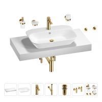 1 x cтолешница для раковины, арт. 162018000 (размер 100*50 см, цвет матовый белый); 1 х керамическая раковина, арт. 151301000 (размер 65*45 см, цвет глянцевый белый); 1 x декоративная заглушка на отверстие перелива раковины (цвет хром); 1 х смеситель для раковины, арт. 182403000 (цвет золото); 2 х гибкая подводка для подключения смесителя, 45 см; 1 x сифон для раковины, арт. 182121000 (цвет золото); 1 x донный клапан для раковины, арт. 182131000 (цвет золото); 2 x угловой вентиль, арт. 182148000 (цвет золото); 1 x дозатор для жидкого мыла с держателем, арт. 182513000 (стекло матовое, держатель золото); 1 x мыльница с держателем, арт. 182503000 (стекло матовое, держатель золото); 1 x стакан для зубных щеток с держателем, арт. 182508000 (стекло матовое, держатель золото); 2 x крючок для полотенца/халата, арт. 182518000 (цвет золото); 6 x комплект креплений для монтажа; 9 x инструкция по монтажу и эксплуатации; 9 x гарантийный талон. |