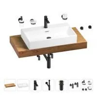 1 x cтолешница для раковины, арт. 162010000 (размер 100*50 см, цвет светлый дуб Оксфорд); 1 х керамическая раковина, арт. 150903000 (размер 70*41 см, цвет глянцевый белый); 1 x декоративная заглушка на отверстие перелива раковины (цвет хром); 1 х смеситель для раковины, арт. 182402000 (цвет матовый черный); 2 х гибкая подводка для подключения смесителя, 45 см; 1 x сифон для раковины, арт. 182120000 (цвет матовый черный); 1 x донный клапан для раковины, арт. 182130000 (цвет матовый черный); 2 x угловой вентиль, арт. 182147000 (цвет матовый черный); 1 x дозатор для жидкого мыла с держателем, арт. 182512000 (стекло матовое, держатель матовый черный); 1 x мыльница с держателем, арт. 182502000 (стекло матовое, держатель матовый черный); 1 x стакан для зубных щеток с держателем, арт. 182507000 (стекло матовое, держатель матовый черный); 2 x крючок для полотенца/халата, арт. 182517000 (цвет матовый черный); 7 x комплект креплений для монтажа; 9 x инструкция по монтажу и эксплуатации; 9 x гарантийный талон. |