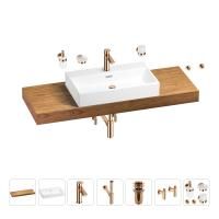 1 x cтолешница для раковины, арт. 162012000 (размер 140*50 см, цвет светлый дуб Оксфорд); 1 х керамическая раковина, арт. 150903000 (размер 70*41 см, цвет глянцевый белый); 1 x декоративная заглушка на отверстие перелива раковины (цвет хром); 1 х смеситель для раковины, арт. 182304000 (цвет розовое золото); 2 х гибкая подводка для подключения смесителя, 45 см; 1 x сифон для раковины, арт. 182122000 (цвет розовое золото); 1 x донный клапан для раковины, арт. 182132000 (цвет розовое золото); 2 x угловой вентиль, арт. 182149000 (цвет розовое золото); 1 x дозатор для жидкого мыла с держателем, арт. 182514000 (стекло матовое, держатель розовое золото); 1 x мыльница с держателем, арт. 182504000 (стекло матовое, держатель розовое золото); 1 x стакан для зубных щеток с держателем, арт. 182509000 (стекло матовое, держатель розовое золото); 2 x крючок для полотенца/халата, арт. 182519000 (цвет розовое золото); 7 x комплект креплений для монтажа; 9 x инструкция по монтажу и эксплуатации; 9 x гарантийный талон. |