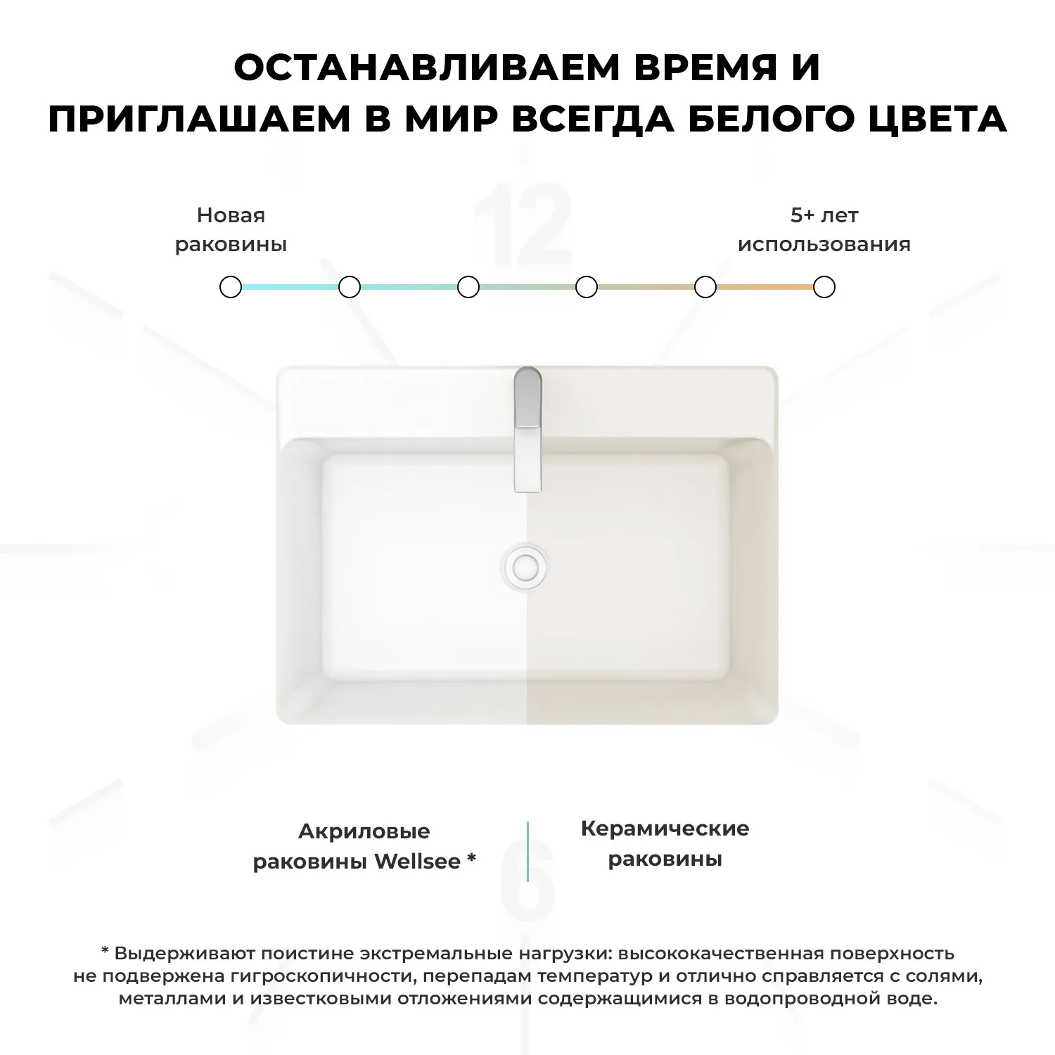 В отличие от раковин из керамики или искусственного камня, гидрофобность и высокий коэффициент плотности акрилового материала гарантируют износостойкость и долговечность раковин Wellsee с приоритетом на безупречную гигиеничность и функциональность. Гладкая беспористая поверхность акриловых раковин не накапливает бактерии, известковый налет и не требует тщательного ухода, тактильно приятная и легко поддается реставрации. Повышенная стойкость к истиранию, выцветанию и желтизне сохранит эстетичный внешний вид изделия долгие годы.